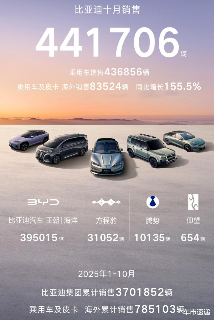 根据比亚迪公开的销售数据显示,比亚迪在传统销售旺季“金九银十”收获了837976台的好成绩,其中,10月销量441706台,创下单月销量历史新高度,其中,海外出口83524台。2025年1-10月累计销量达到了3701852台,其中,海外市场累计销量785103台。